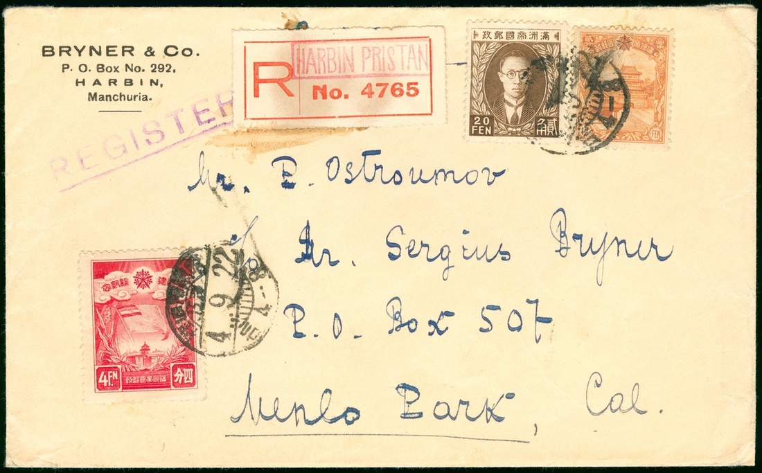 1937 (4 Sept.) Manchukuo A registered mail cover from Harbin to California USA, total rated 36 fen, tied by Harbin c.d.s., with US arrival c.d.s. on the back