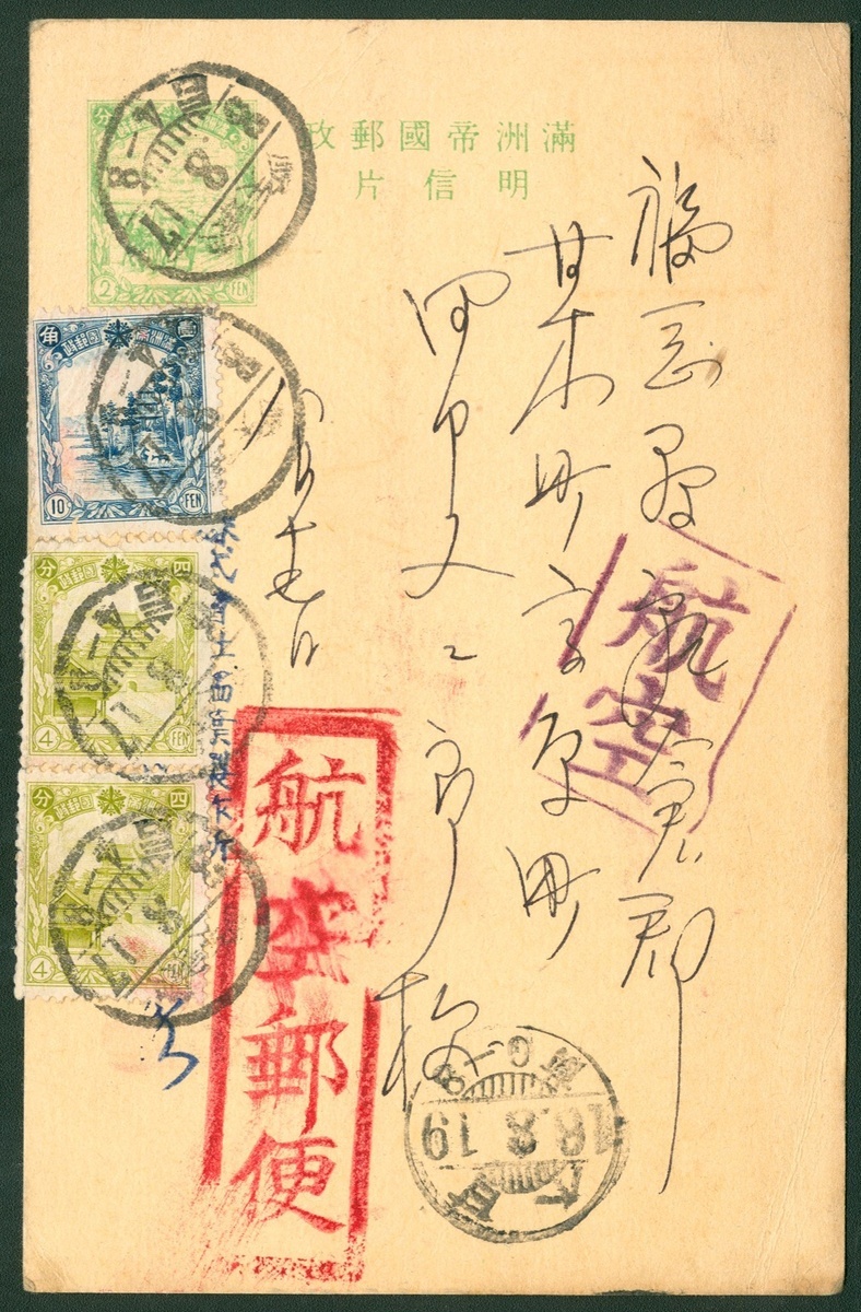 1941 Mukden to Amagi , Japan 2c. postage card by Air mail, uprated 4c.(2) and 10c.(1), tied by Mukden c.d.s., with Amagi 19 Aug. arrival c.d.s.