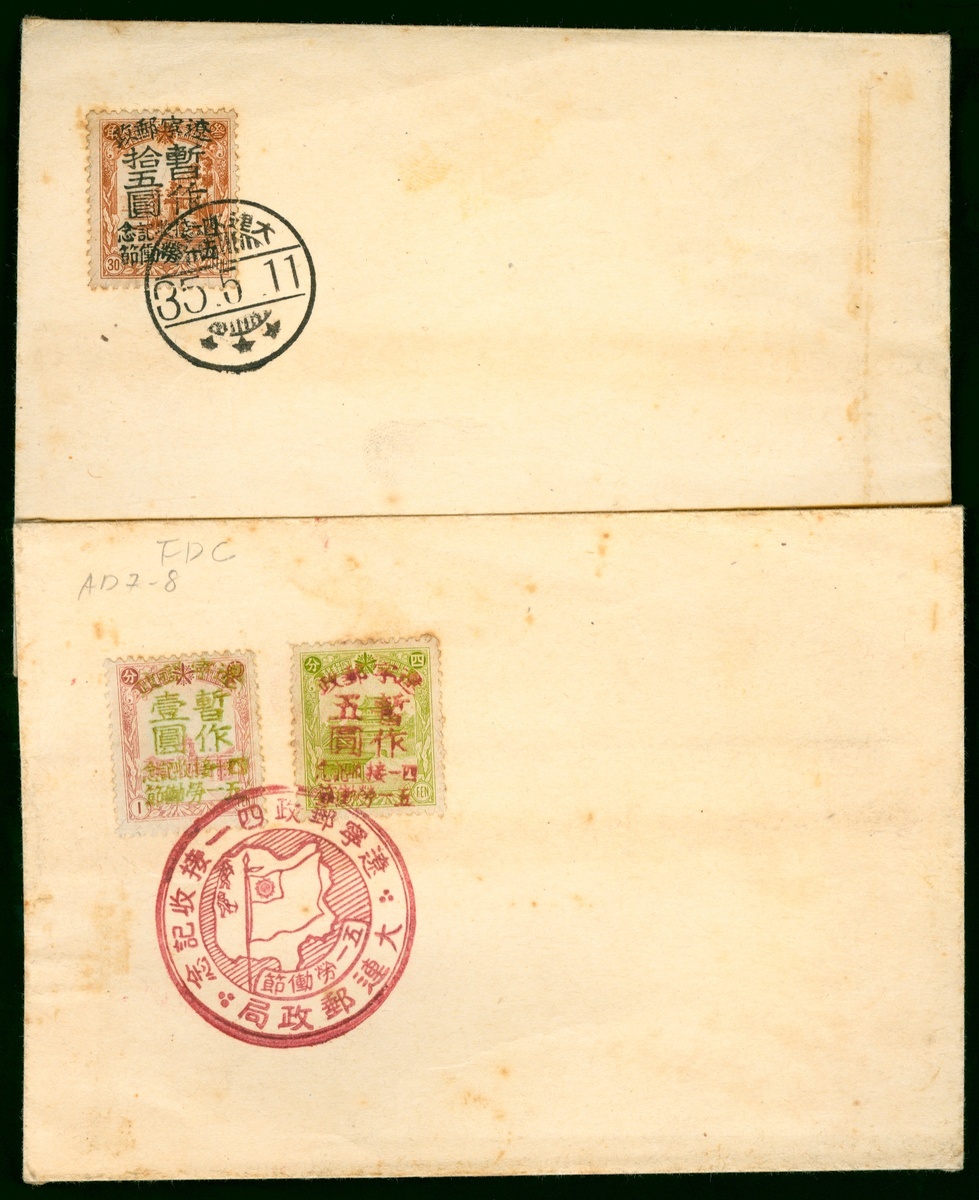 1946 Stamps overprinted with "Liaoning Posts Temporarily Used for " Receiving on Apr.1 and May 1st, International labour Day" firstday covers, tied by Dalian Memorial Stampand, and other cover tied by Dalian 11 May c.d.s.