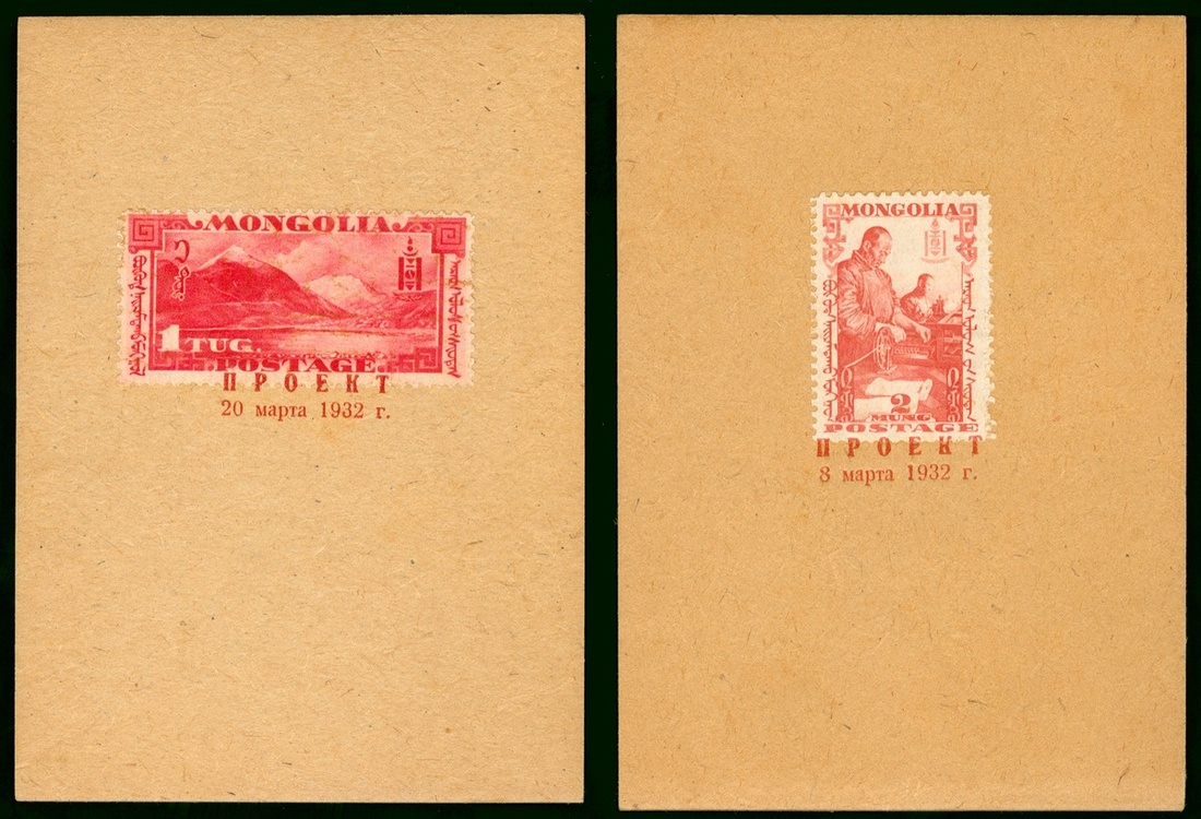 1932 Mongolia two proofs on two thick crepe paper, with proof seal in Russian. fine and scarce.