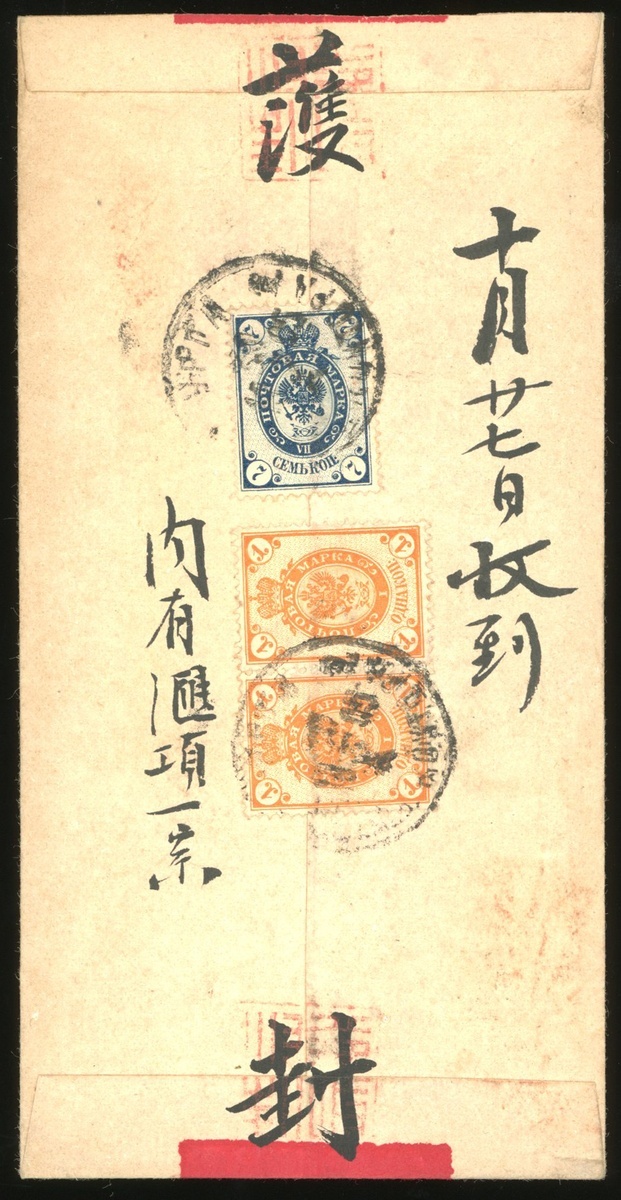 1905 (13 Oct.) Commercial red band cover to Kalgan bearing, on the reverse, 1k orange x 2 & 7k blue tied by fair strikes of the type 4 c.d.s.