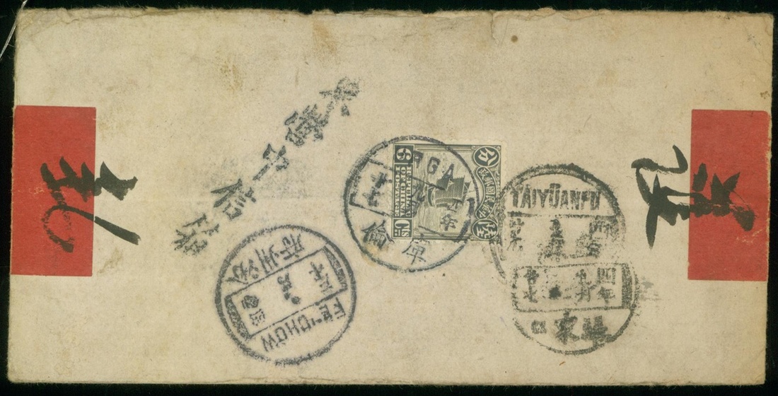 1915 (27 Sep.) red band cover to Fenyang bearing London Print Junk 6c tied by Urga bilingual c.d.s.,Tongyintsechung Letter Box handstamp alongside, with Changkiakow, Taiyuanfu transit c.d.s and Fenchow arrival (30.9)