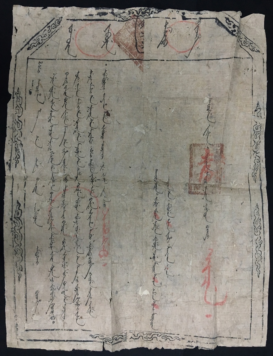 Qing dynasty 1817. Letter from Minister staying at the Western Zan (Tibet) to resolve any issues Sent to the clerks of many ports, customs and guards on the road. Subject: Nobleman and his accompanying 10 people who went from the capital city to Tibet are returning to their capital city because they can't accustomed on water and soil. Please put this item on the section of Manchu or Tibet because it is a letter issued by the Tibetan and belonging to the period of Manchu. Only they returning destination is the capital city.