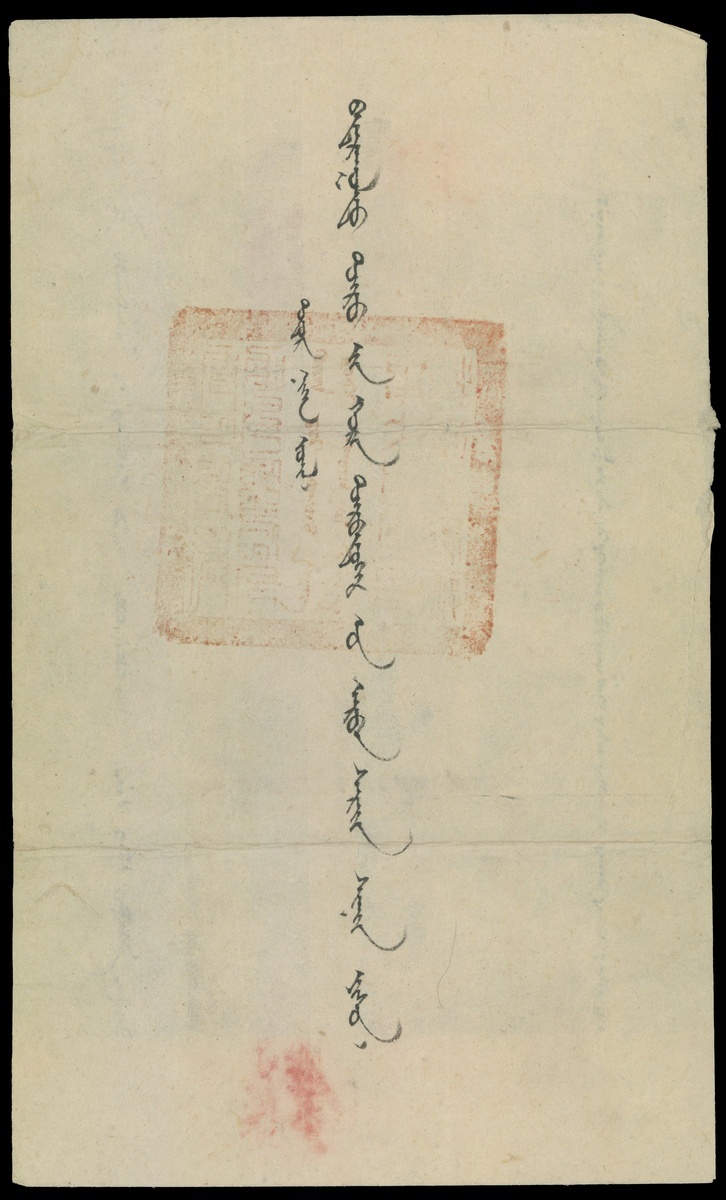 Qing dynasty. October 09, 1899. A script of Setsen King, a minister staying at the capital city of Uliastai treasury of the new position appointed according to the order and resolving any issues. Sent to the graf Choisuren, a chairman of the Assembly of Tsetserleg and other people.