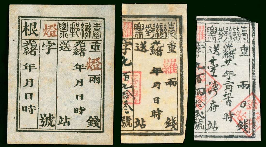 1885 Taiwan Official Postage Stamp first Issue, and 1886 two used Second Issue, all handstamped in black on laid paper.
