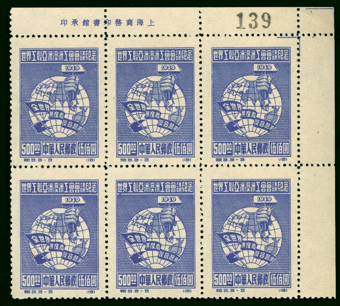 1949 (C3) Trade Unions, original print, complete set of three with left or right corner imprint margin block of six, very lightly toned and folded.