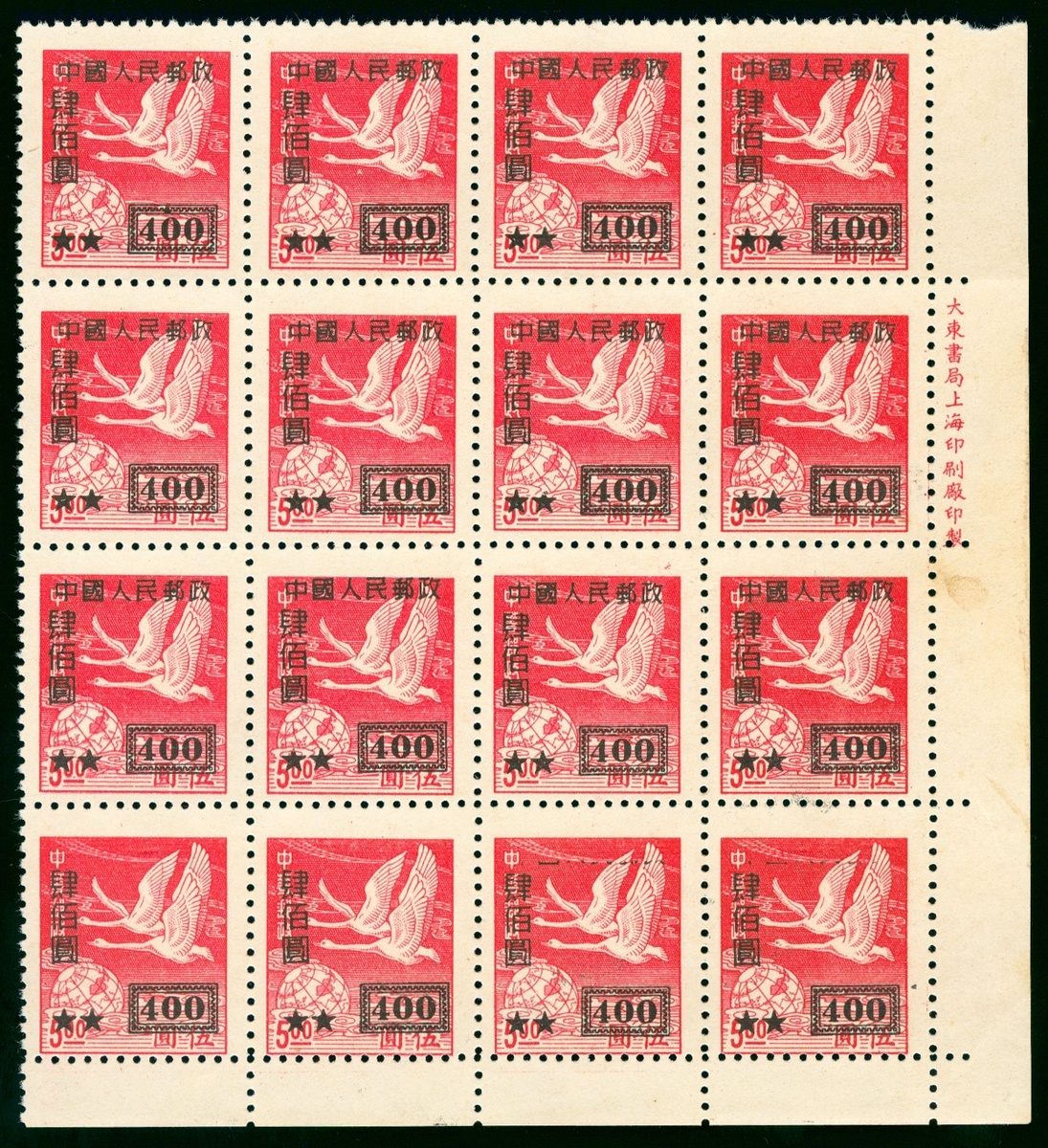 1950 Surch. on Flying Geese, block of sixteen with lower right imprint margin, lower row 4 stamps missing China People Post variety, this is non constant variety, unused very rare.