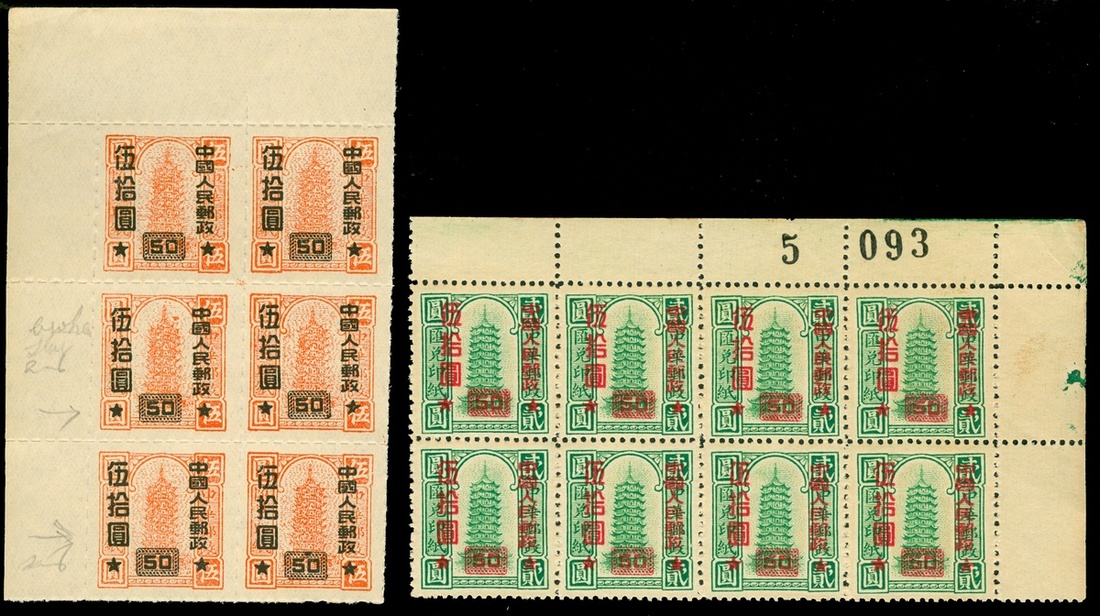 1951 Surcharge on Money Order stamps. (Pagoda), $50 on $2, block of eight x 5, $50 on $5, block of four x 13, block of six x 2,plus $50 on $50, all with constant varieties, unused.