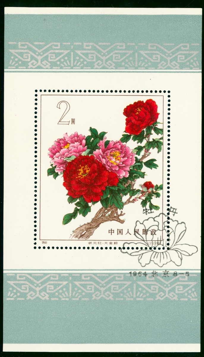 1964 (S61M) Chinese Peonies. Miniature sheet tied by first day issue cancellation, with original gum, fresh and fine. Yang S61MS.