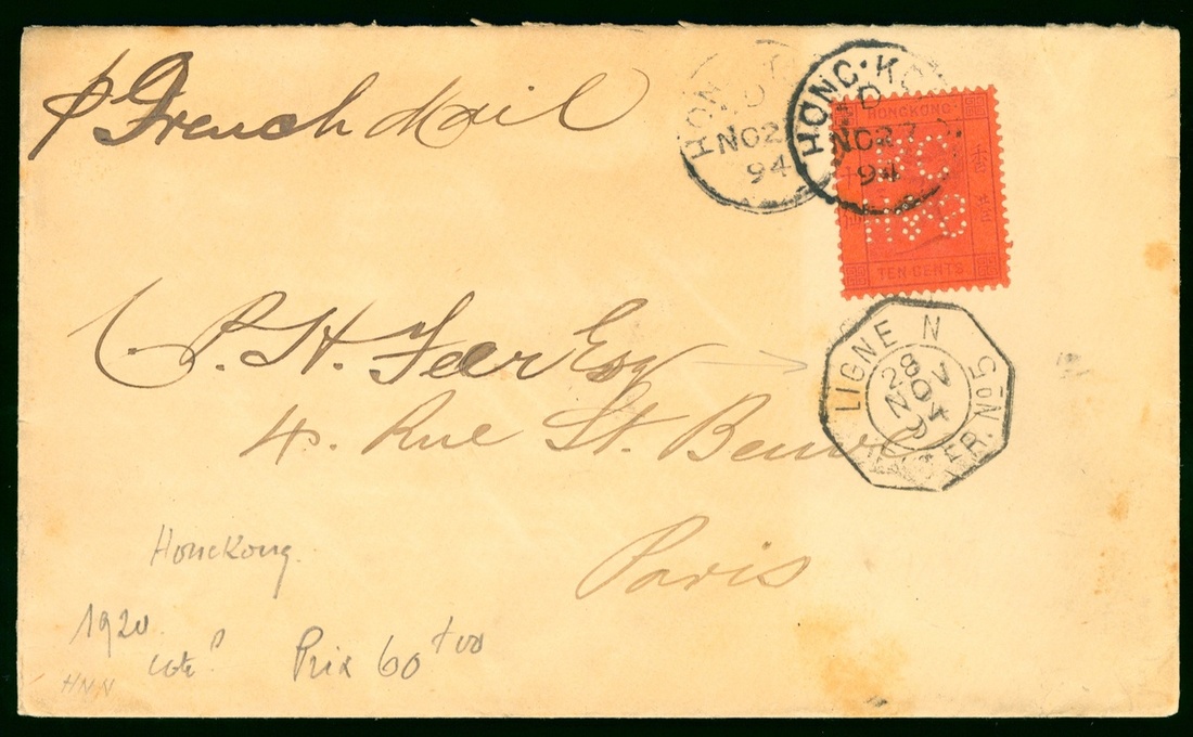 1894 (27 Nov.) Hong Kong cover to Paris, f.w. 10c QV stamp with"B.C.H.&S. perfin, tied by Hong Kong c.d.s.