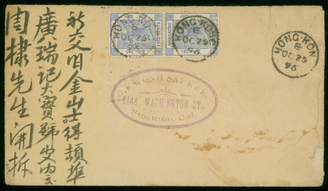 1895 (25 Oct.) Hong Kong cover to USA, f.w. a pair of 5 cents QV stamps tied by Hong Kong c.d.s. Stockton CAL & San Francisco arrival c.d.s. on reverse