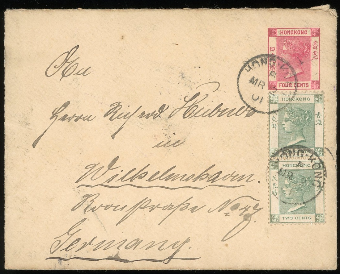 1901 (2 Mar.) a Q.V. 4c. per-stamp envelope added 2c. pair to Germany (8Apr.)