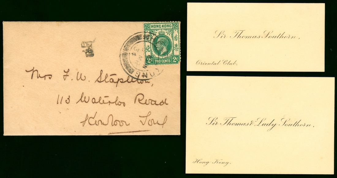 1934 (6 Mar.) a mini cover to local with Sir Thomas Southorn and his wife’s name cards, interesting.