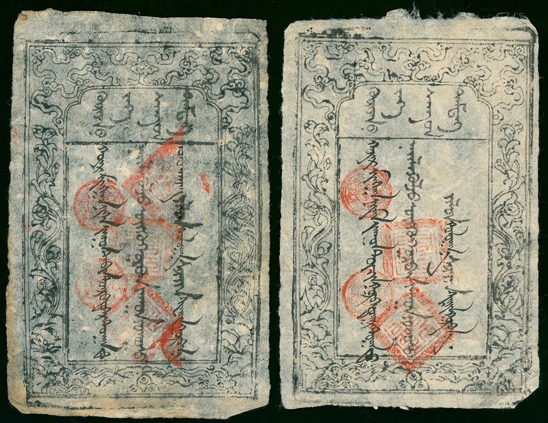 Mongolia, Great Treasury of Khuree, lot of 2 notes for 300 coins, 1873, black printing on muutuu paper, various red handstamps, the panel reads 'Banknote of the Great Treasury of Khuree', whilst the large central panel contains three lines of writing stating the serial number, the denomination and date of issue, the serial number and date are filled by brush writing, one the note has an extra control seal at top right,