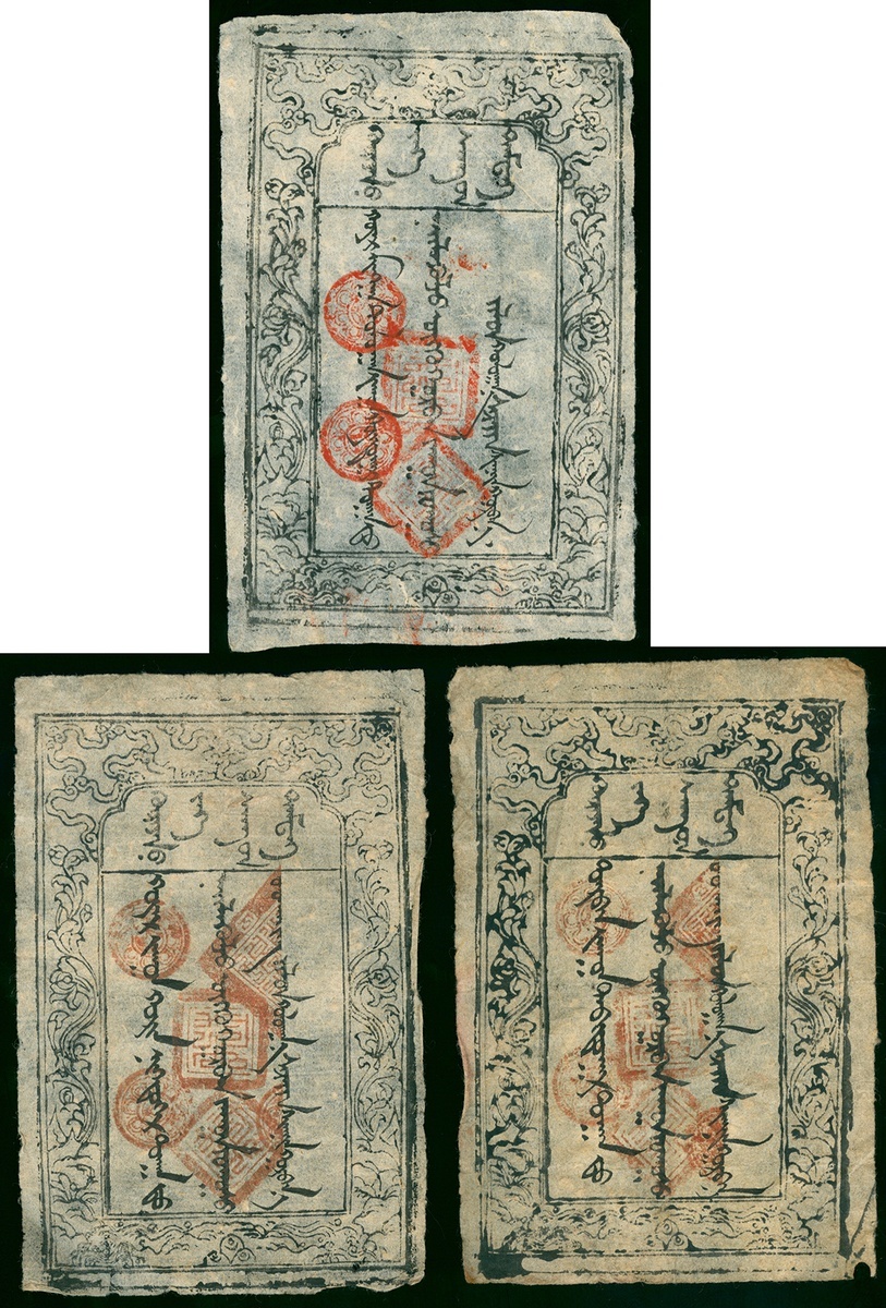 Mongolia, Great Treasury of Khuree, lot of 3 notes for 300 coins, 1873, black printing on muutuu paper, various red handstamps, the panel reads 'Banknote of the Great Treasury of Khuree', whilst the large central panel contains three lines of writing stating the serial number, the denomination and date of issue, the serial number and date are filled by brush writing, one the note has an extra control seal at top right,