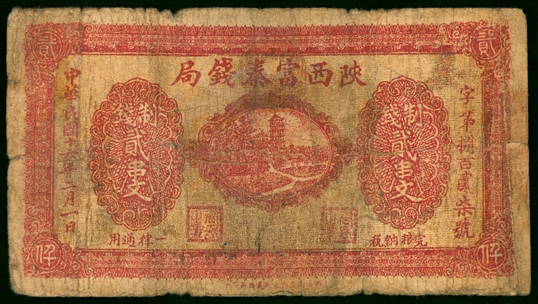 Shensi Fu Ching Chien Chu, 2 chuan, 1.2.1927, serial number 827, (S2607B), fine, very rare for this denomination.
