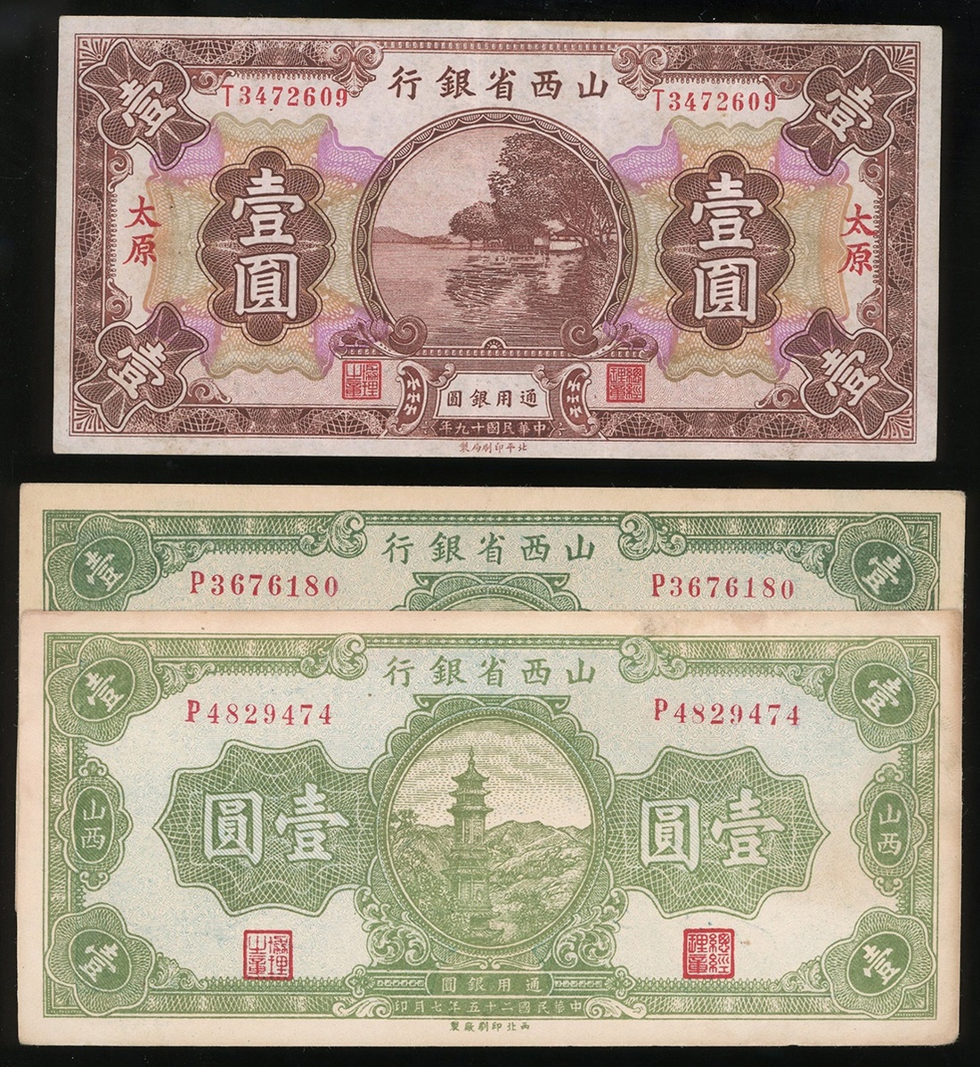 The Shansi Provincial Bank, a group of 3x notes, 1 yuan Taiyuan, 1930 and Shansi, 1936 (2), serial numbers T3472609, P3676180, P4829474,