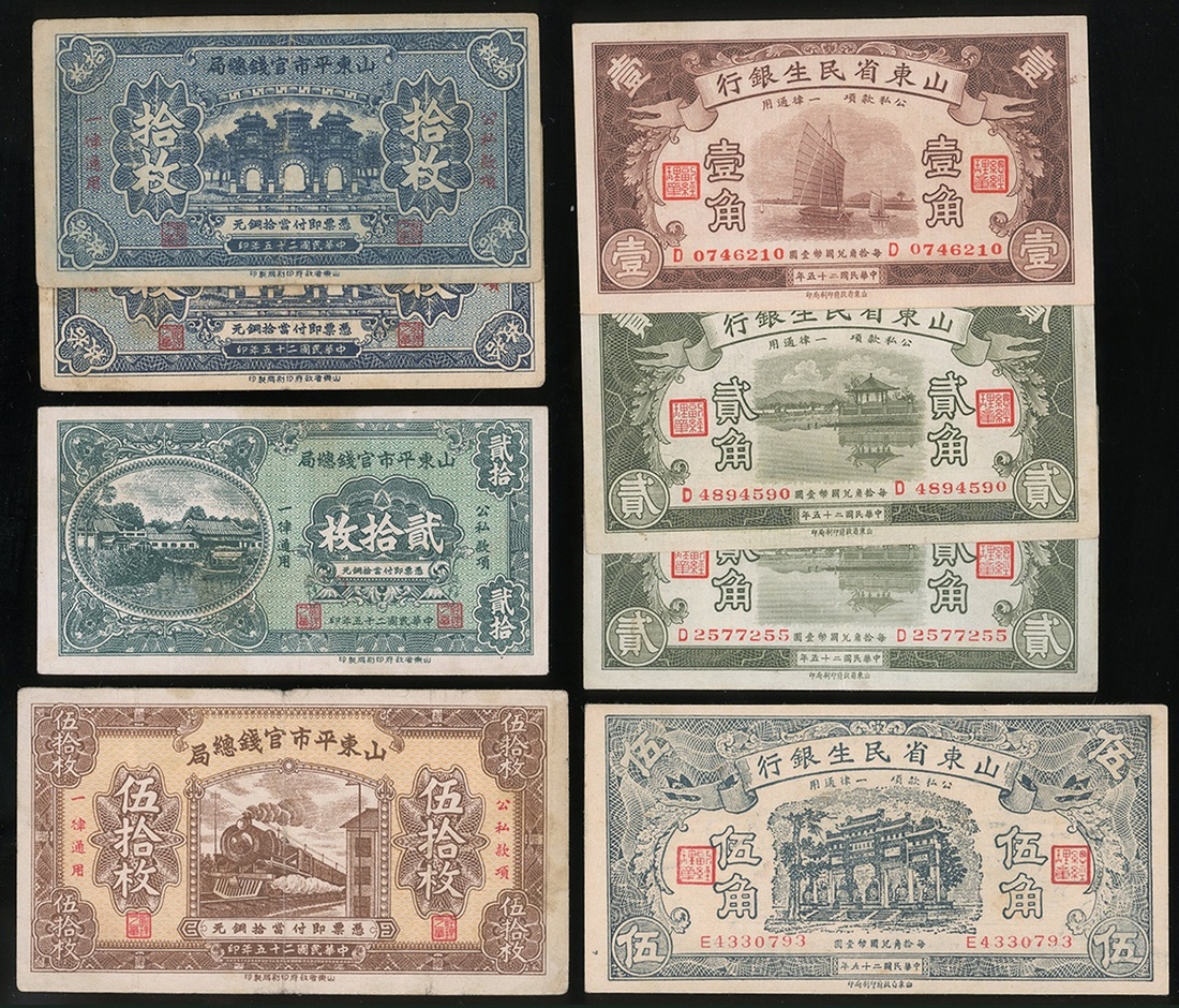 Mixed lot, a group of 8x notes from two issuing banks, 1936, 1940, Shantung Exhange Bureau, 10 copper coins (2), 20 copper coins, 50 copper coins, serial numbers 3784391, A5309548A, 6485369, A0026845A; Shantung Min Sheng Bank, 10 cents, 20 cents (2), 50 cents, serial numbers D0746210, D2577255, D4894590, E4330793,
