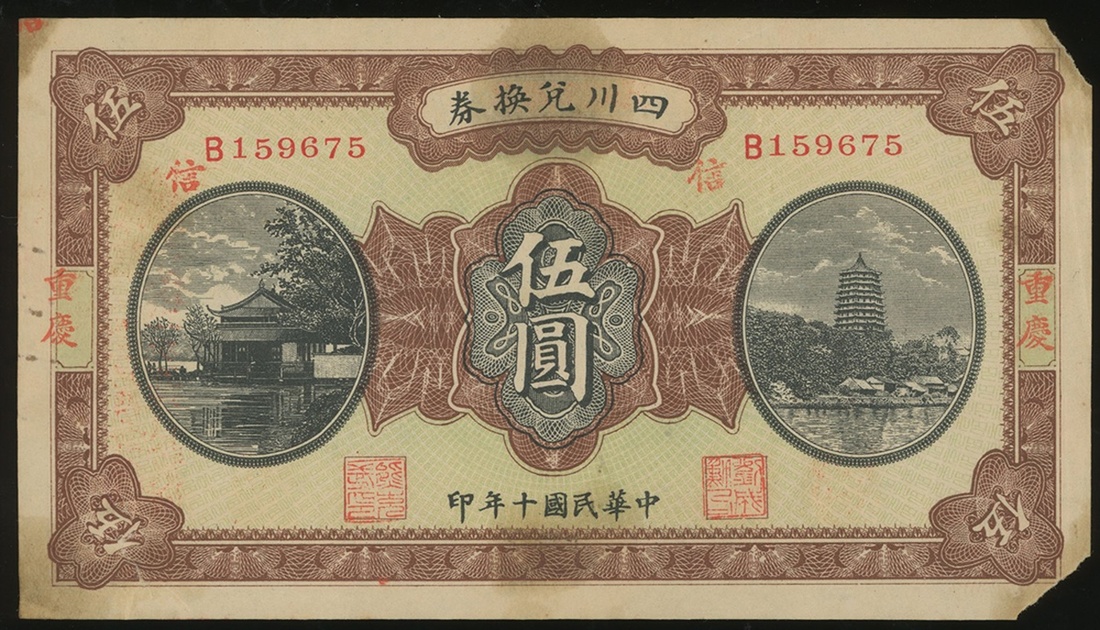 1921年四川兌換券5元,重慶地名,編號B159675,GEF品相卻是缺角品,少見