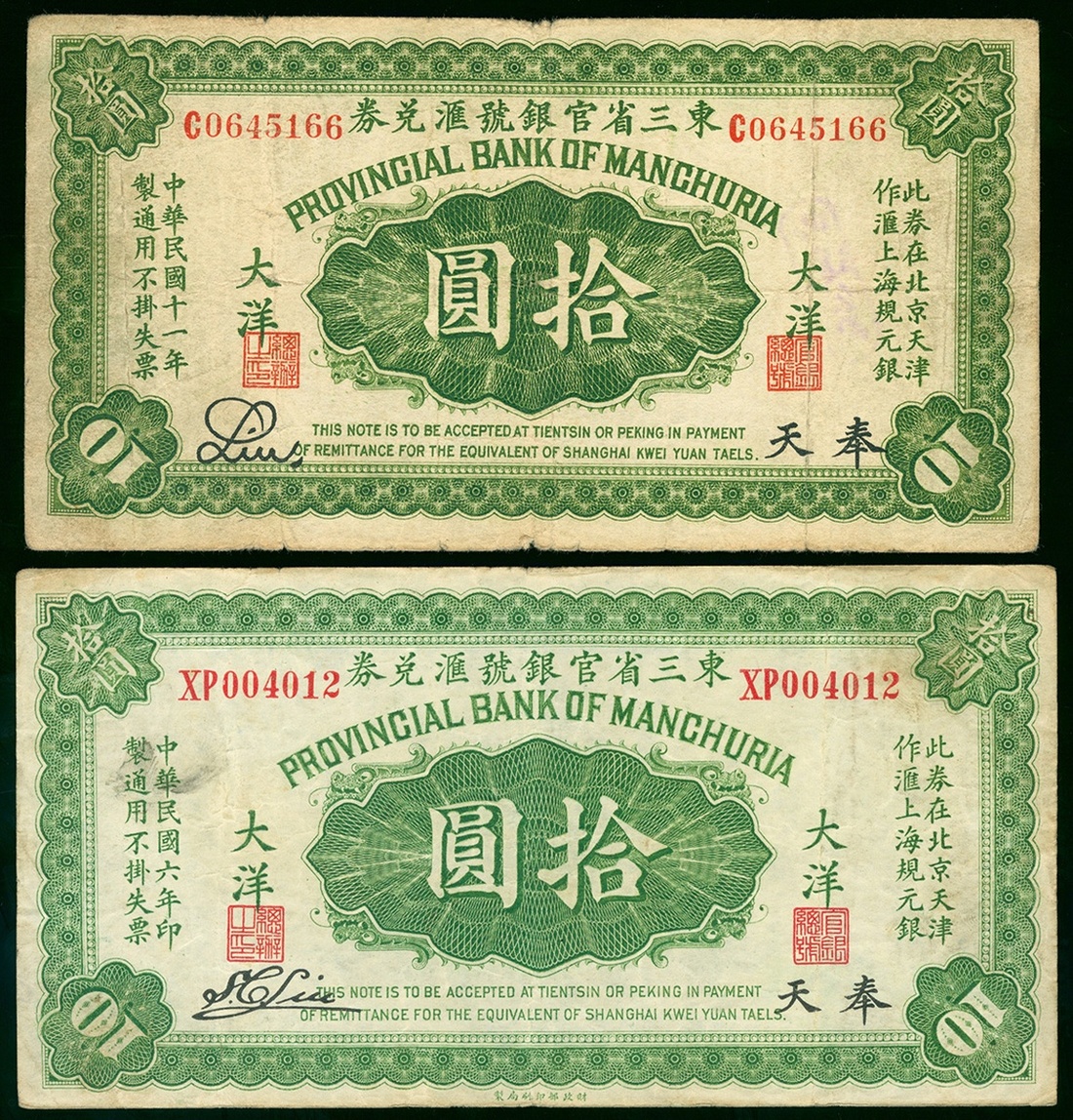 Provincial Bank of Manchuria, a pair of 10 yuan, Fengtien, 1917 and 1922, serial numbers XP004012 and C0645166, (Pick S2899 and S2938), fine to very fine.(2).