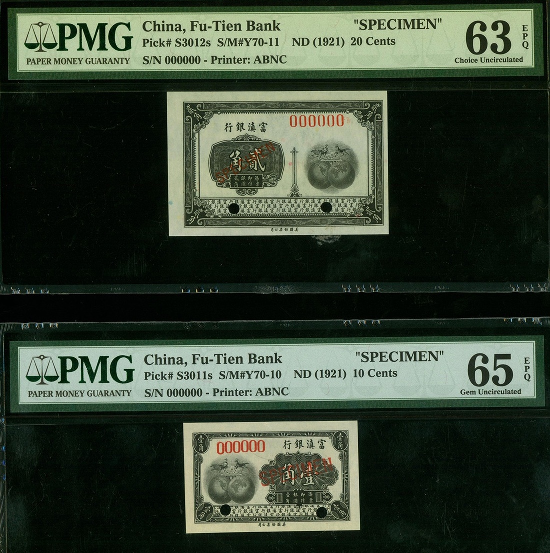Fu-Tien Bank, 10, 20 Cents, specimens, ND(1921), serial number 000000, (Pick S3011s, S3012s), PMG 65EPQ Gem Uncirculated and 63EPQ Choice Uncirculated (2)