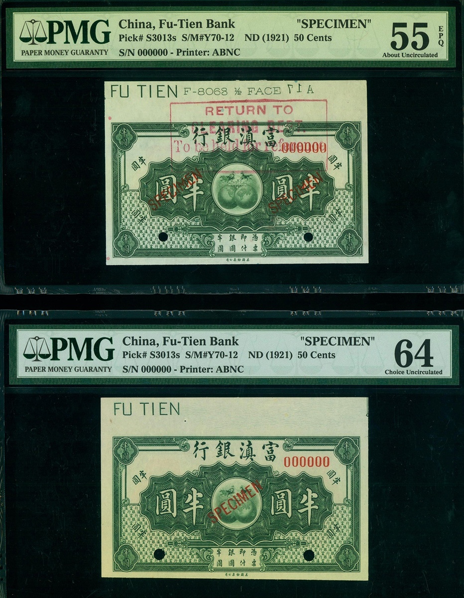 Fu-Tien Bank, Half Dollar, specimens, ND(1921), serial number 000000, one 'normal' specimens, the other with the printer's stamp 'RETURN TO CLEARING DEPT. TO BE HELD FOR REFERENCE', clearly an official document held by the printers, both notes have extra selvedge at top border,