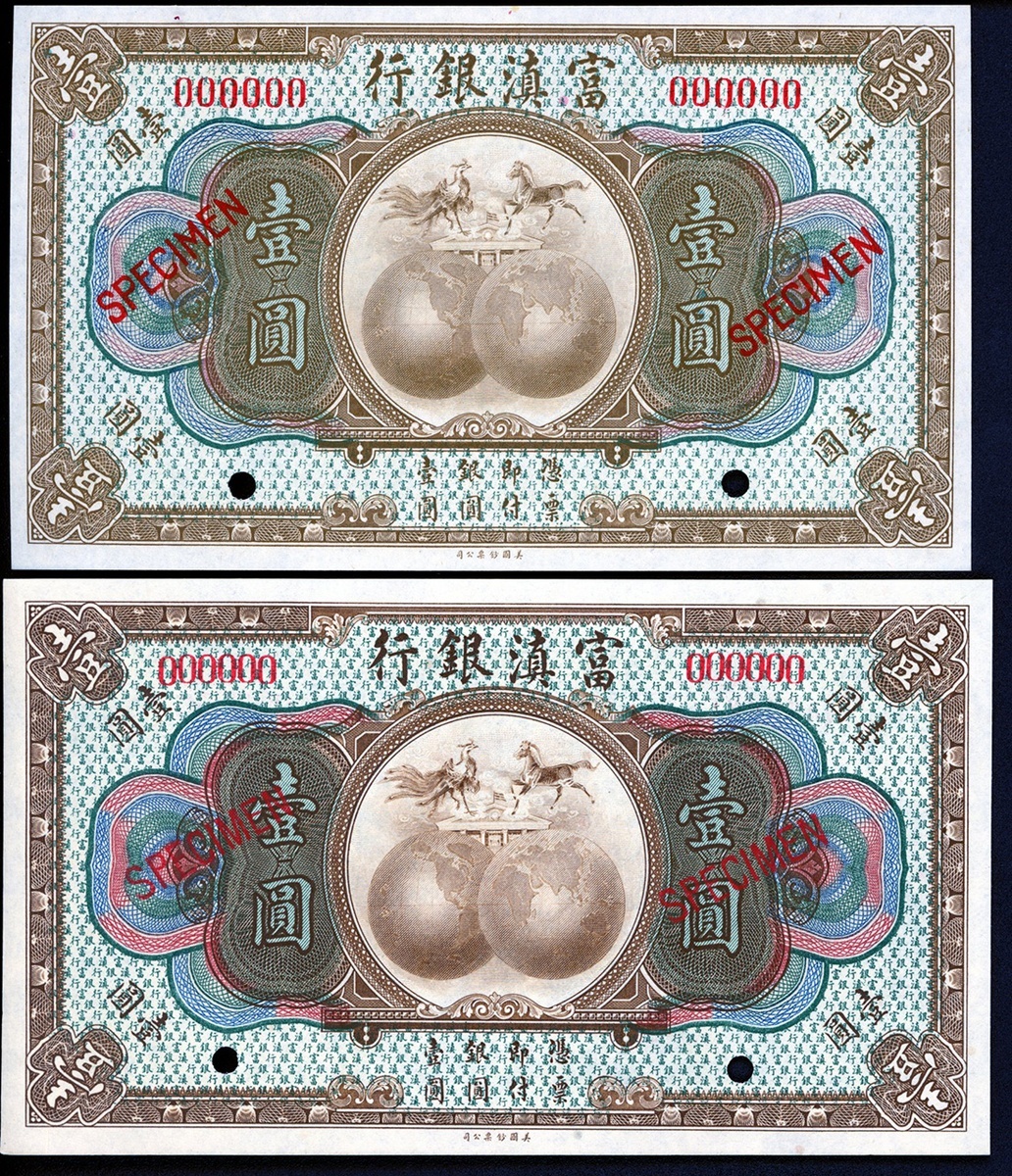 民國十年富滇銀行壹圓樣票一組兩枚,均AU-UNC