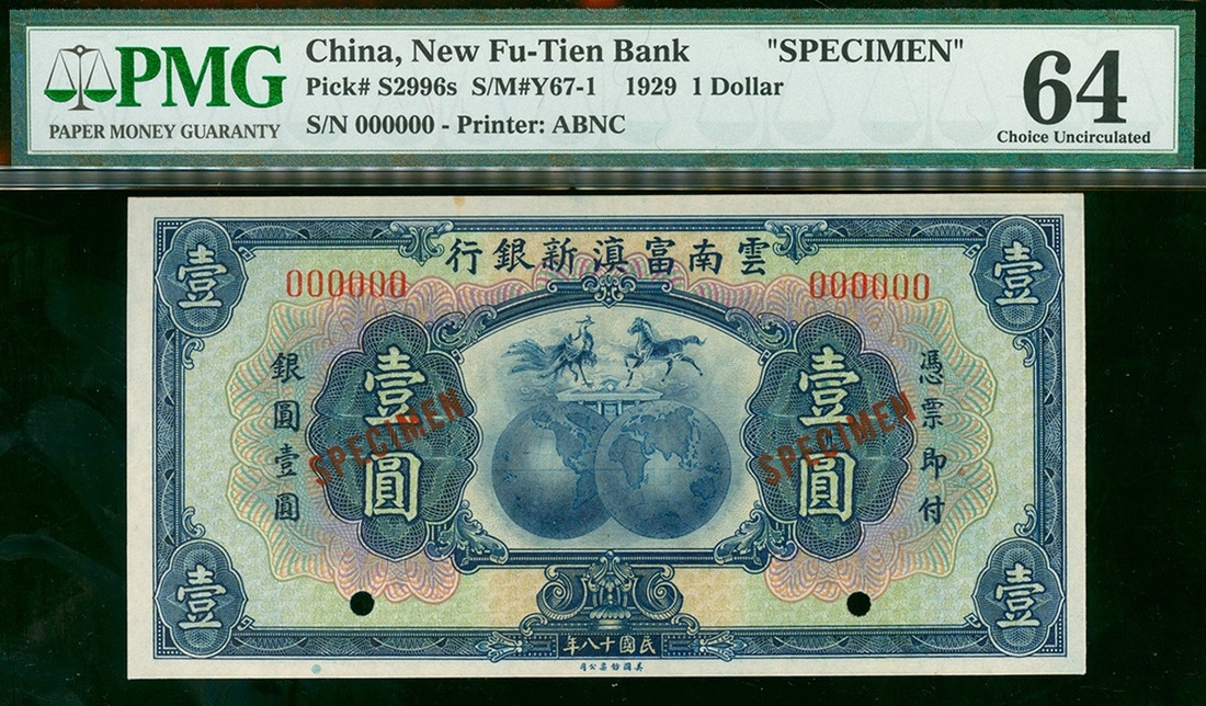1929年雲南富滇新銀行1元樣本,PMG64EPQ