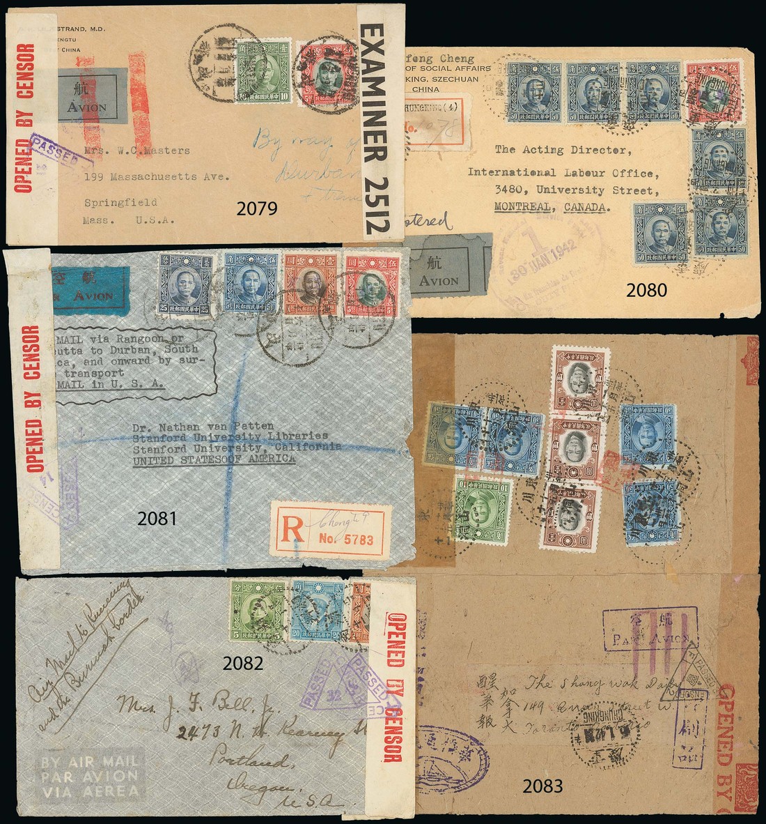 1941 (31 Dec.) official mail envelope registered to Montreal bearing $8 franking tied by Chungking c.d.s. with the registration label at left and grey-blue Par Avion etiquette. with censor seal at side and arrival backstamp (30.1). An interesting rate paying postage $1, registration $1 but there was no $6 rate for airmail. However, this letter reached it's destination in a very short time. Photo
