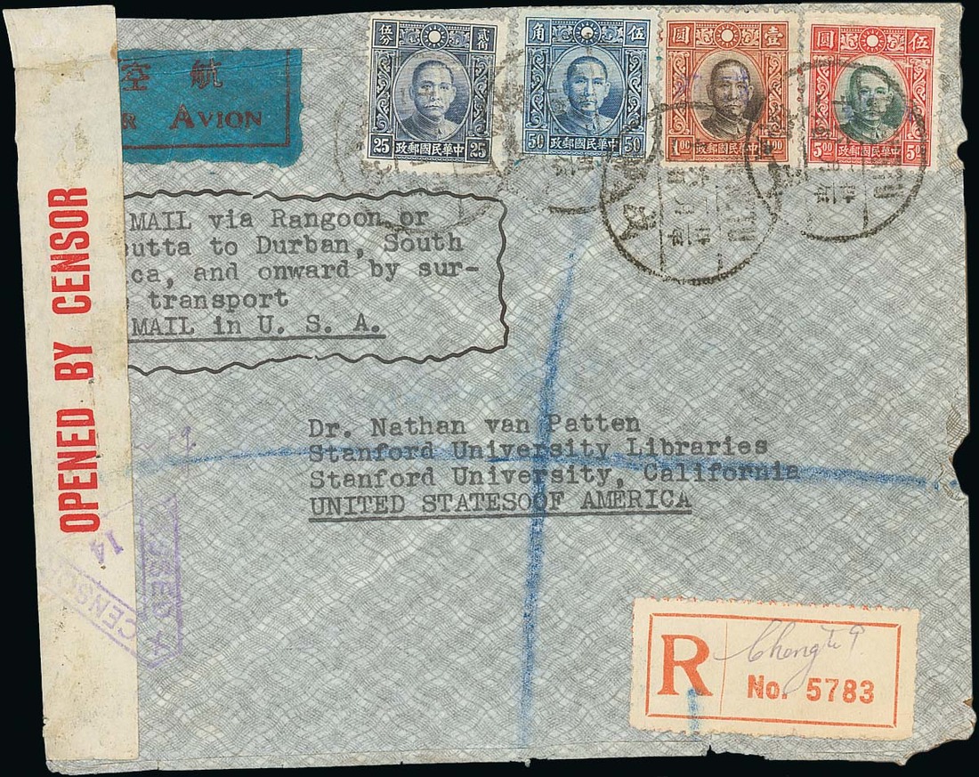 1942 (6 Jan.) envelope registered to California "Air Mail via Rangoon or Calcutta to Durban, South Africa, and onward by surface transport Air Mail in U.S.A." bearing $6,75 franking tied by Chengtu c.d.s. with registration label (manuscript name) and red on blue Par Avion etiquette, Rangoon "14" censor handstamp and seal and, on the reverse, New York (31.3), San Francisco and Stanford (2.4) datestamps. Pays postage $1, registration $1, air mail $4.10 and air mail in U.S.A. 65c. Photo