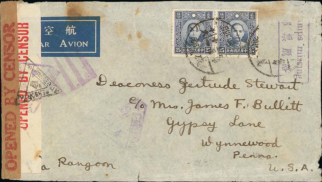 1942 (11 Feb.) air mail envelope to U.S.A. "Via Rangoon" bearing 50c. franking (one adhesive has fallen off) tied by Chengtu c.d.s., with Rangoon and Calcutta censor seals and handstamp, Durban jusqu'à in purple and a good strike of boxed Chinese/English "Stamps missing" struck in purple, with Chungking backstamp (4.3). It is speculated that this was salvaged from a crash explaining the missing stamp and staining on the reverse. Photo