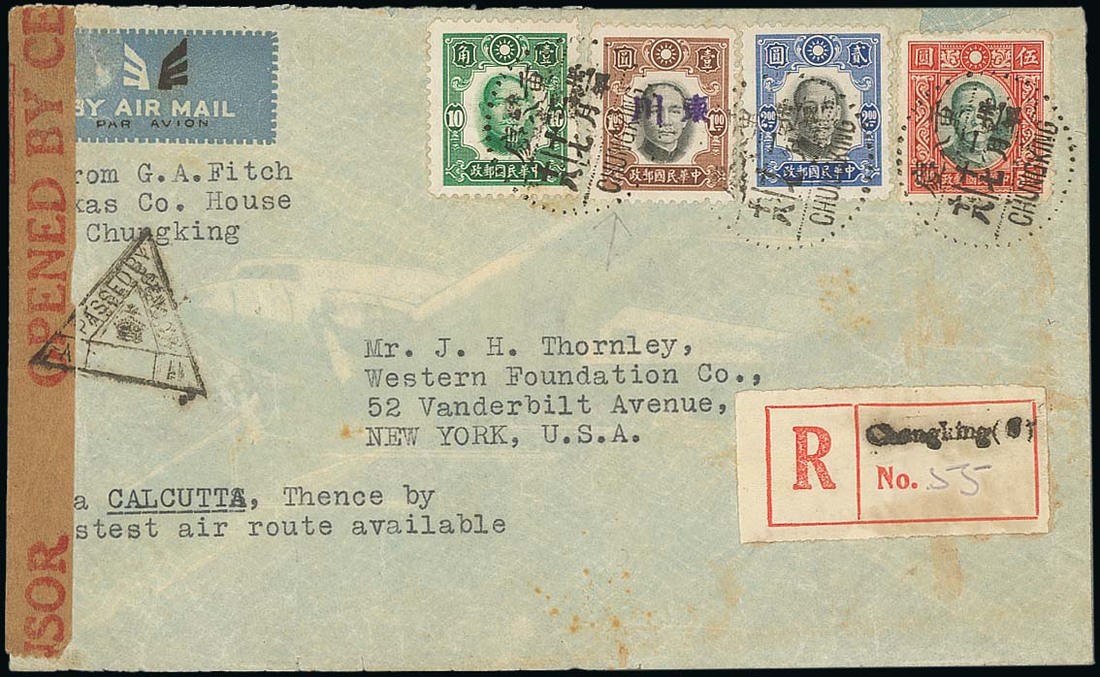1942 (17 Jan.) air mail envelope registered to New York "Via Calcutta, Thence by fastest air route available", bearing $8.10 franking (dollar values with anti-bandit handstamps) tied by Chungking c.d.s. with the registration label alongside and, on the reverse, different New York (25.3) datestamps with Calcutta censor seal and handstamp; a few faint tone spot. Pays postage $1, registration $1 and air mail $6.10 by route 7. Photo
