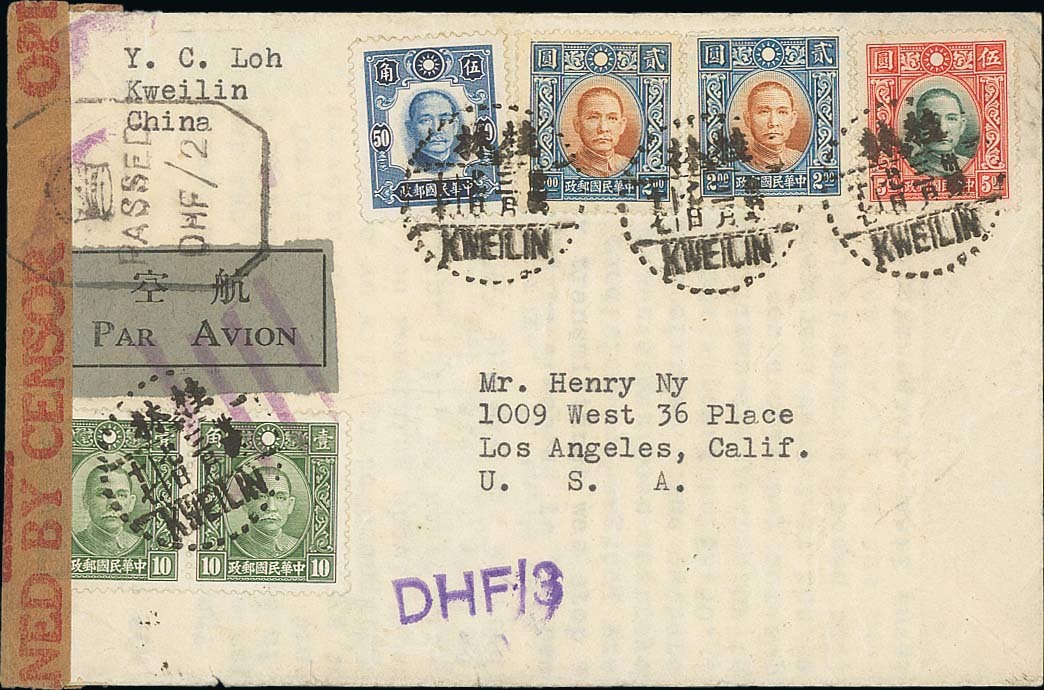 1942 (3 Mar.) envelope to Henry Ny in Los Angeles bearing $9.70 franking tied by Kweiling c.d.s. with grey-blue Par Avion etiquette (cancelled by Durban jusqu'à in purple) Calcutta censor seal and handstamp plus DHF/3" struck in purple and, on the reverse, Kunming (3.3) c.d.s. Pays postage $1 and international air $8.70 by route 8.