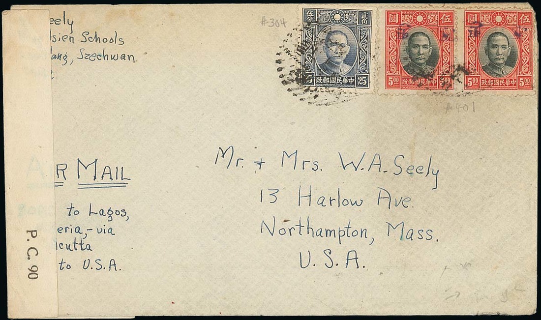 1942 (14 Feb.) envelope to Northampton, Mass. "Air Mail BOAC to Lagos, Nigeria - via Calcutta, PAA to U.S.A." bearing $10.25 franking tied by Kintang c.d.s. with censor seal at side. The dollar values with the scarce Kintang anti-bandit handstamp. Seems to overpay postage $1 and air mail $8.70 by route 8. Photo