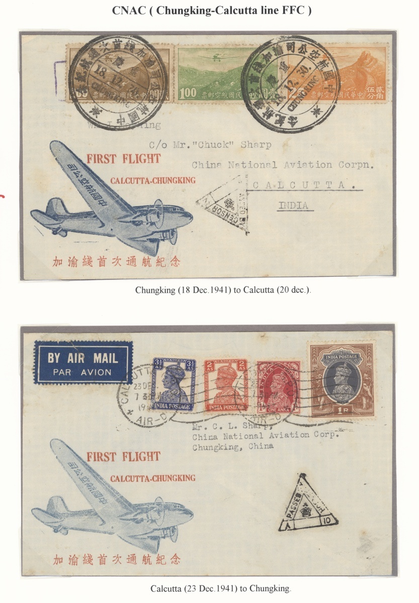1941 (18 Dec.) two illustrated first flight covers commemorating the first flights between Chunking and Calcutta, the first from Chungking to Calcutta bearing $3.25 franking tied by commemorative Chungking c.d.s., the second with India 1r. 6½a. tied by Calcutta machine postmark; both cover with Calcutta censor handstamp. Fine. (2 covers)