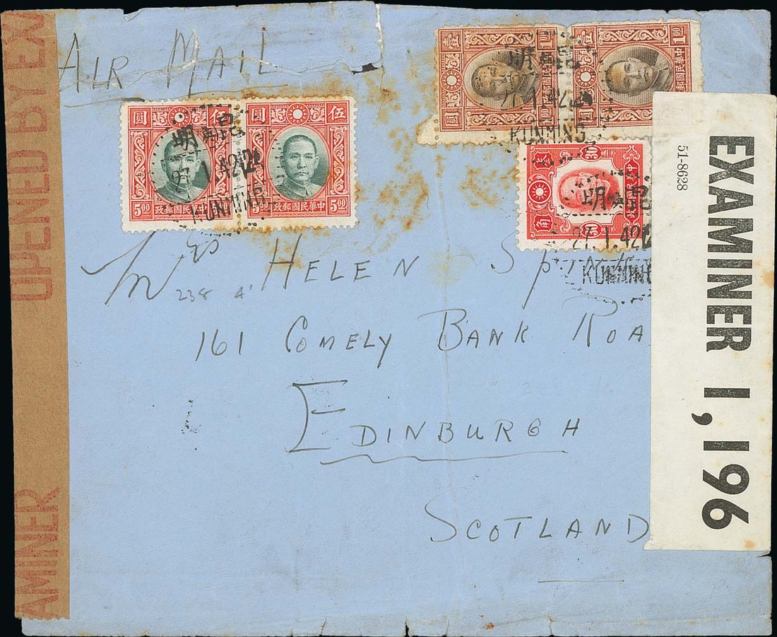 1942 (27 Jan.) envelope to Edinburgh bearing $12.30 franking tied by Kunming c.d.s. with Calcutta and British censor seals. Some glue marks around the adhesives and a few faults at top, nevertheless and rare and important cover paying postage $1 and air $11.30 by Imperial Airways route III, by CHinese airways to Calcutta, BOAC to Lagos, thence to Lisbon via Miami by PAA and overland to Scotland via London. Thought to be one of only two cover charged at this fee which was used between January 21st and February 25th. Photo