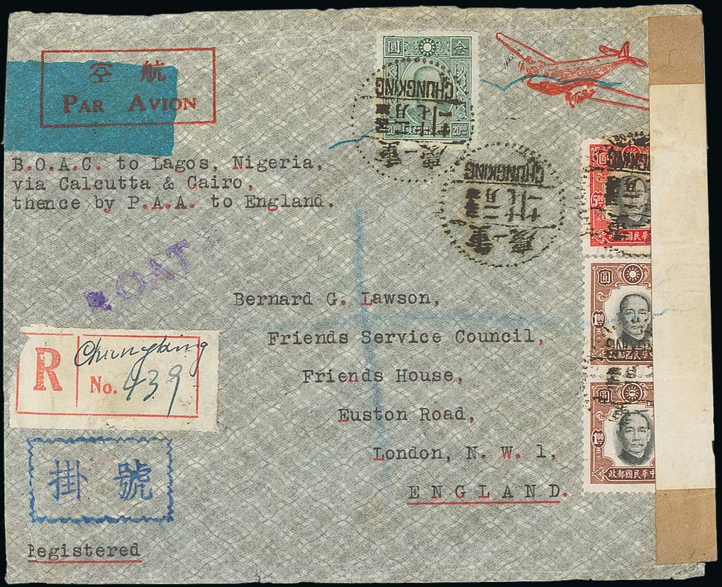 1943 (17 Feb.) envelope registered to London "B.O.A.C. to Lagos, Nigeria, via Calcutta & Cairo thence by P.A.A. to England" bearing $27 franking tied by Chungking c.d.s. with the registration label at left and handstruck "OAT" in purple; with Calcutta and London censor seals on one side. Pays postage $2.50, registration $21.50 and double Imperial Airways $11.70 for route III (ovepaid by 60c.). Photo