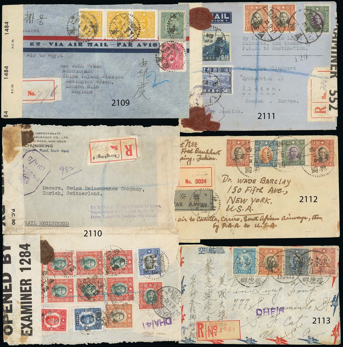 1942 (22 Sept.) air mail envelope registered to Sweden "By B.O.A.C. to Lagos via Calcutta, and thence by P.A.A. to destination" bearing $13.71 franking tied by Yiyang c.d.s. with unattributed registration label and Calcutta censor seal with red wax seals plus British censor seal on the opposite side. Pays postage $1, registration $1 and air mail $11.70 by B.O.A.C. route III. Photo