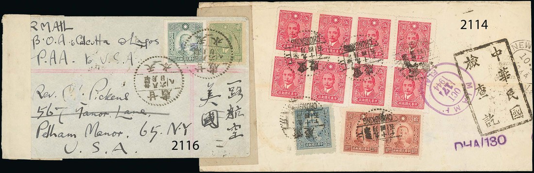 1944 (14 Sept.) commercial envelope "Airmail Express" registered to New York bearing, on the reverse, $64 franking tied by Chungking c.d.s. with boxed Chinese censor handstamp alongside, Miami (17.10) and New York datestamps and Indian censor seal at side, the address side with unattributed registration label. Pays postage $4, registered express $14, and triple air mail $18 by route 8, making an overpayment of $2. An interesting cover with connections to the film industry. Photo
