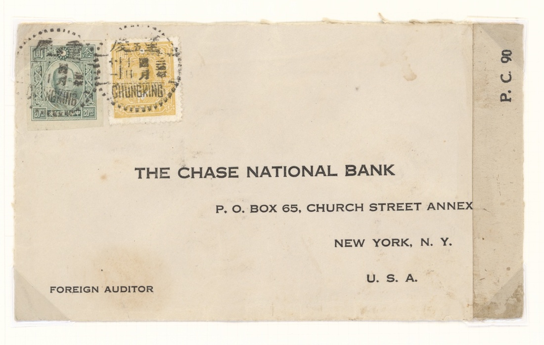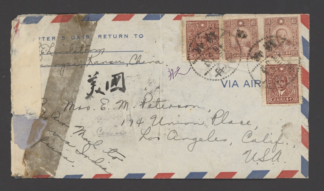 1945 (3 Apr.) air mail envelope to Los Angeles bearing $22 franking tied by Minhsien, Kansu c.d.s. and , on the reverse, Chinese censor handstamp, Kaolan (7.4) and Chungking c.d.s., the two $10 stamps with Minhsien anti-bandit handstamp; soiled and with oil mark from old tape repair. Pays postage $4 and air mail $18 by route 8. Also 1944 (10 Apr.) envelope from Chungking to New York bearing $23 franking and with Indian censor seal which pays postage $2 and double $10.50 by route 8. (2 covers)