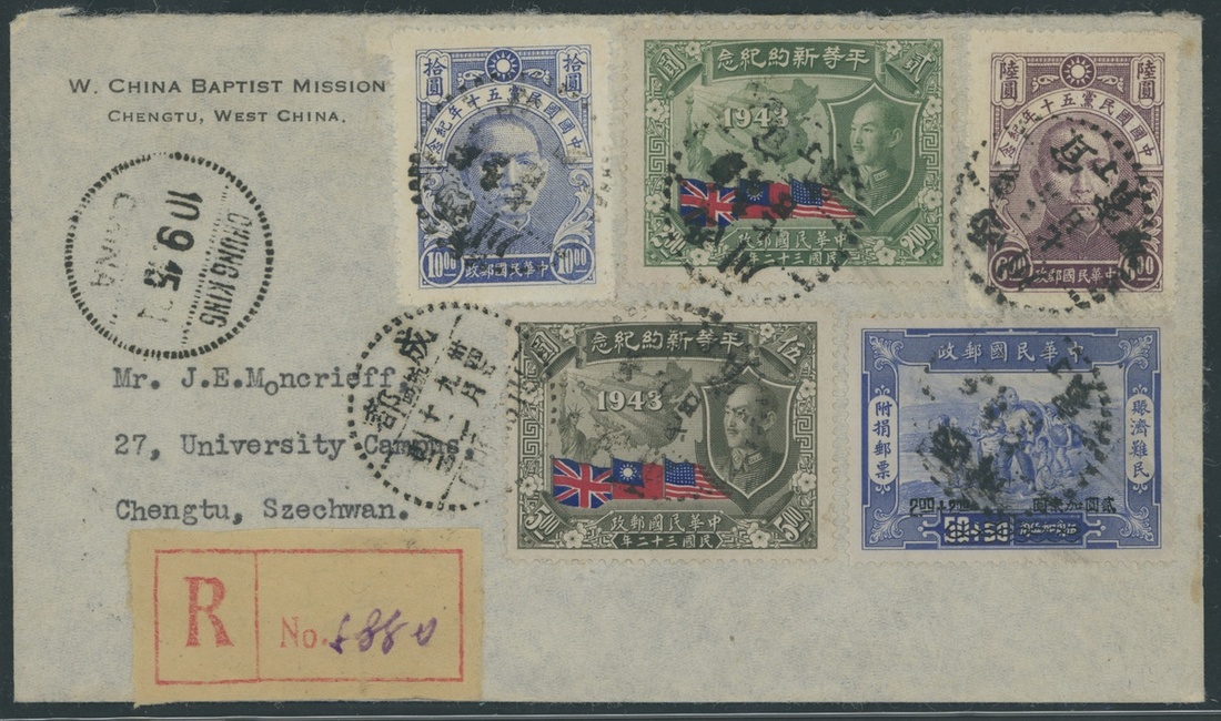 1945 (7 Sept.) envelope registered to Chengtu bearing $25 franking tied by Ipin c.d.s. with rough unattributed registration label with Chungking/China c.d.s. alongside (10.9) and Chengtu Air Station (12.9) c.d.s., the reverse with Chengtu c.d.s. (13.9). Should be paying postage £2, registration $3 and domestic air mail $10; unusual for a mission cover to be over paid