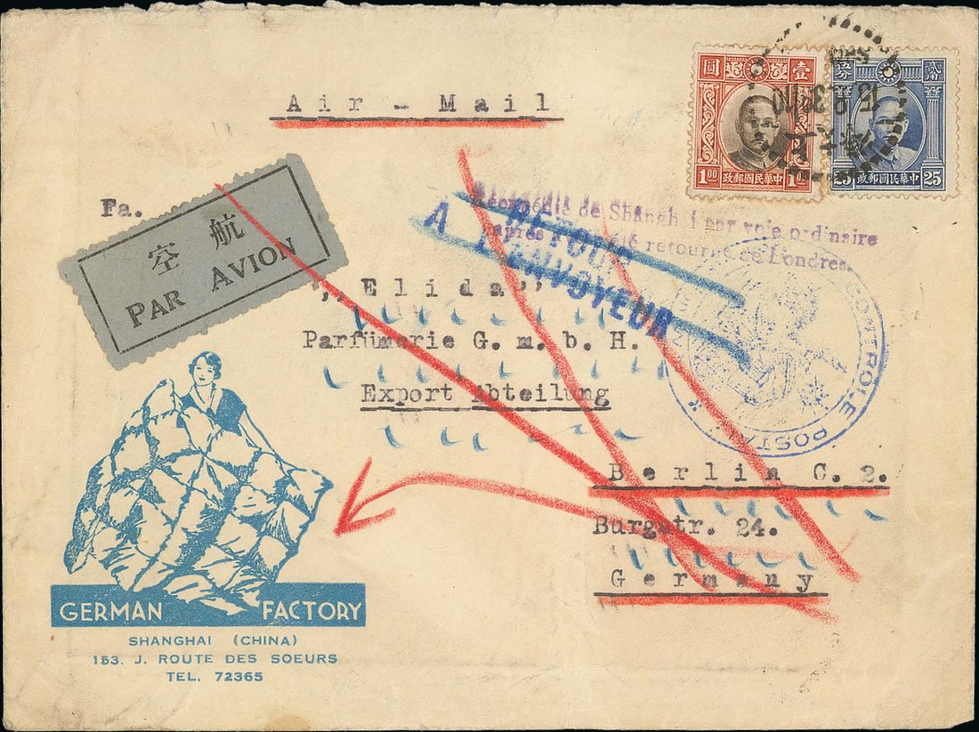 1939年8月15日上海德國工廠寄柏林商業航空封, 貼一圓二角五分郵資, 銷上海日戳, 並貼灰藍色航空簽紙, 此封首先於8月18日經香港, 其後在法國被檢查並蓋上法文指示戳, 並回遞上海, 再經西伯利亞郵路往德國, 並於封背貼上檢查封紙, 是難得的回遞寄發地再遞出之封.