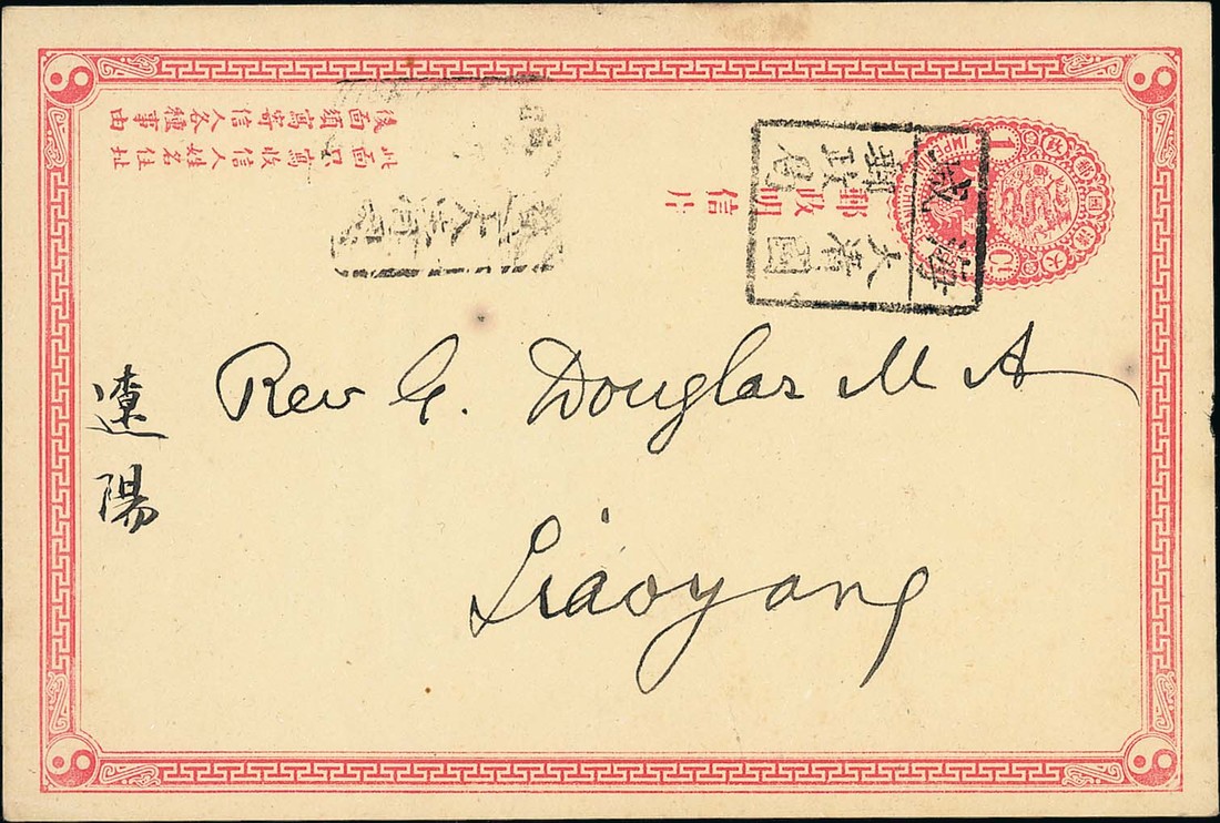 Haicheng (Fukien): 1902 (2 Sept.) first issue 1c. postal stationery card to Liaoyang cancelled by a superb strike of Haicheng rectangle with a poor strike of the Liaoyang rectangle alongside. Fine and scarce. Photo