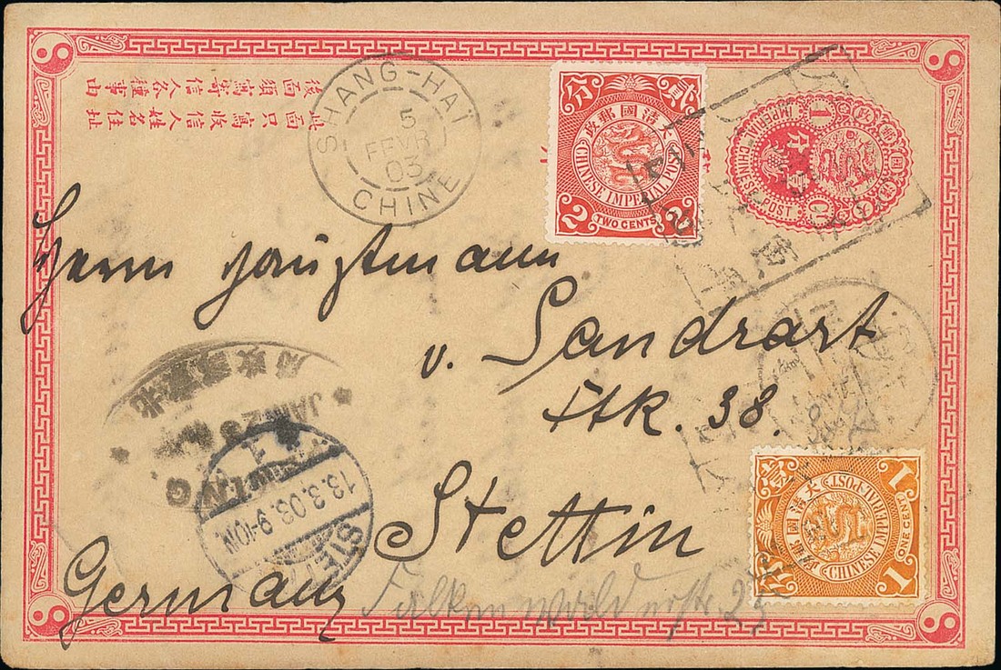 Taiyuanfu (Shansi); 1903 (20.Jan.) 1c. postal stationery card to Germany, uprated with C.I.P. 1c. and 2c. tied by Taiyuanfu Post Office rectangle with date insertion (one strike very faint), with Peking dated oval (28.1), Shanghai bilingual c.d.s and French Post Office c.d.s. (5.2) and Stettin arrival (13.3). An attractive card. Photo