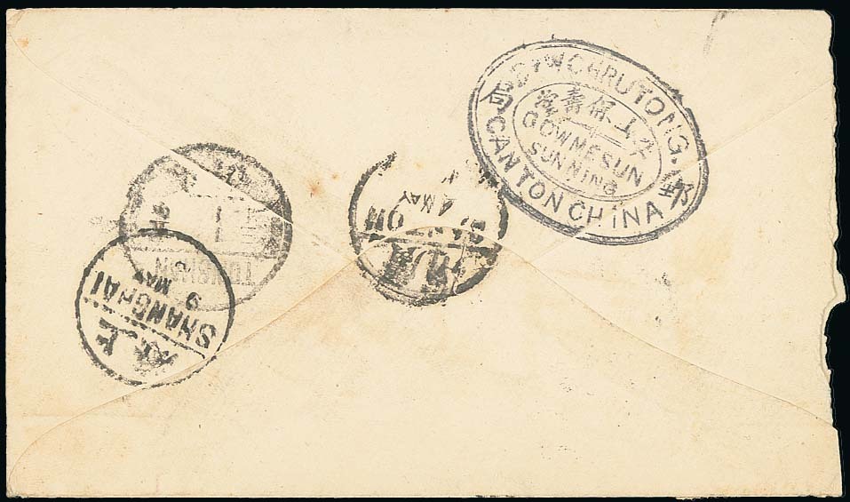 廣東: 1916年4月30日廣東新甯寄美國新倫敦封, 貼壹角帆船票, 銷新甯日戳, 信封背蓋雙橢圓黑色廣東郵政代辦戳, 另有5月3日臺山戳, 5月4日汕頭戳及5月9日上海日戳.