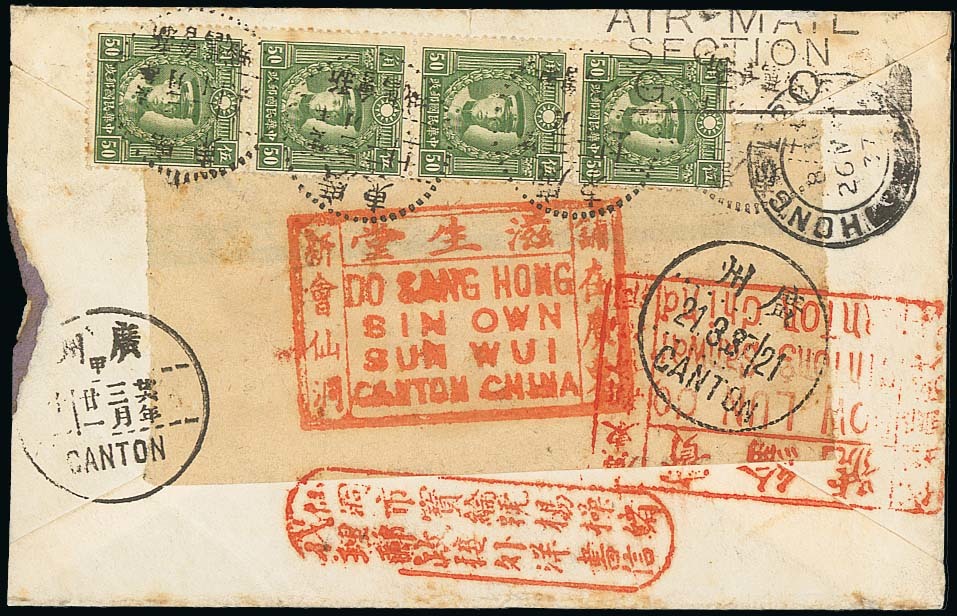 Canton (Kwangtung); 1937 (20 Mar.) envelope sent air mail to New York bearing Sun Yat Sen 25c. and, on the reverse, Martyr 50c. (4) tied by Sinwhei dotted c.d.s., there are two large postal agent's cachets in red, rounded end handstamp in red plus Canton (21.3) and Hong Kong (26.3) transit c.d.s. plus London Air Mail Section handstamp. An unusual cover with great appeal. Pays postage 25c. and air mail $2. Photo