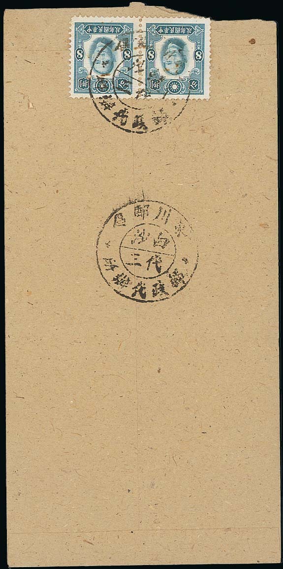 Paisha (Szechwan): 1942 (Nov.) envelope to Chungking bearing, on the reverse, N.Y print 8c. (2) tied by a fine strike of the double-circle postal agent handstamp with a second strike alongside, the address side with Chungking arrival (17.11). With original letter. Photo
