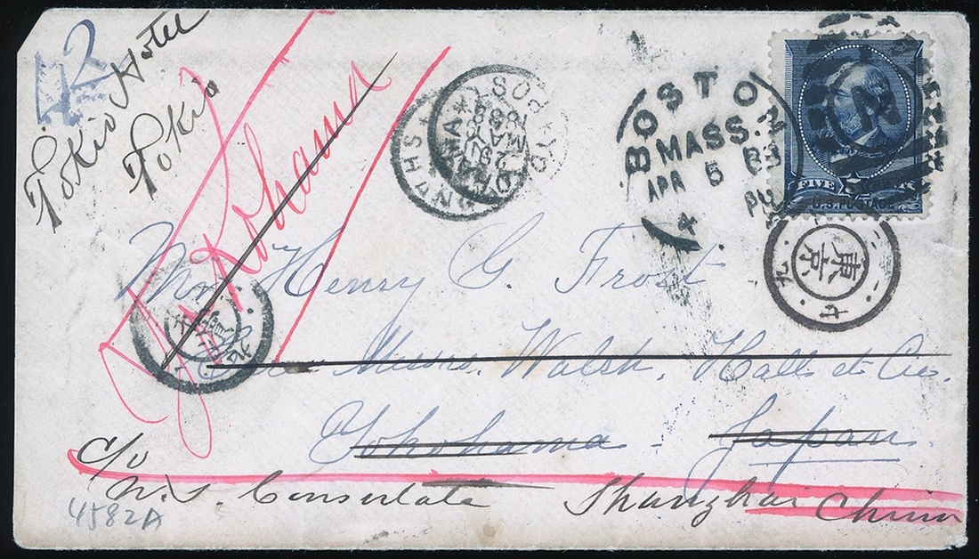 1888年美國波士頓寄日本實寄封1件,貼美國5分郵票1枚,銷波士頓4月5日戳,經三藩市轉,有橫濱到達戳,而後改寄至中國上海,有上海日本客郵局6月5日戳,然後再經橫濱改寄東京,輾轉多次改寄,有多地中轉戳,郵路清晰,十分難得