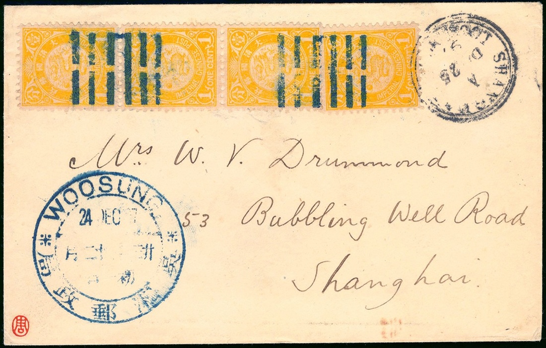 1897年吳淞寄上海實寄封1件,貼石印版蟠龍1分4枚,銷吳淞藍色八卦戳,另銷吳淞97年12月24日大圓戳,有25日上海工部到達小圓戳,小圓戳與郵票騎縫,郵戳清晰,保存完好,此封為藍色吳淞八卦戳最早使用例