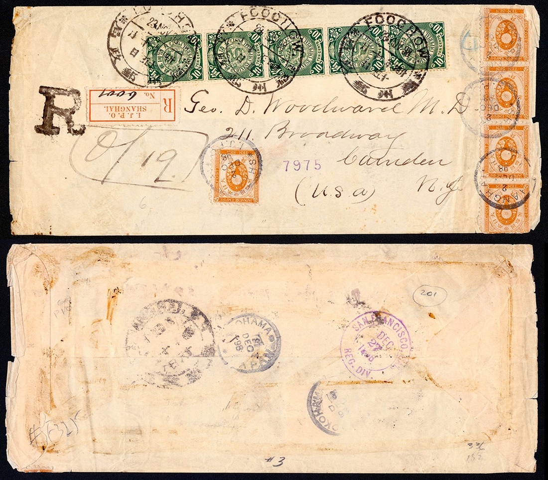 1898 (23 Nov.) a registered envelope to USA bearing 10c. strip of five tied by Foochow dollar dater, via Shanghai with Japan 10c. x 5 tied by Shanghai IJPO c.d.s.